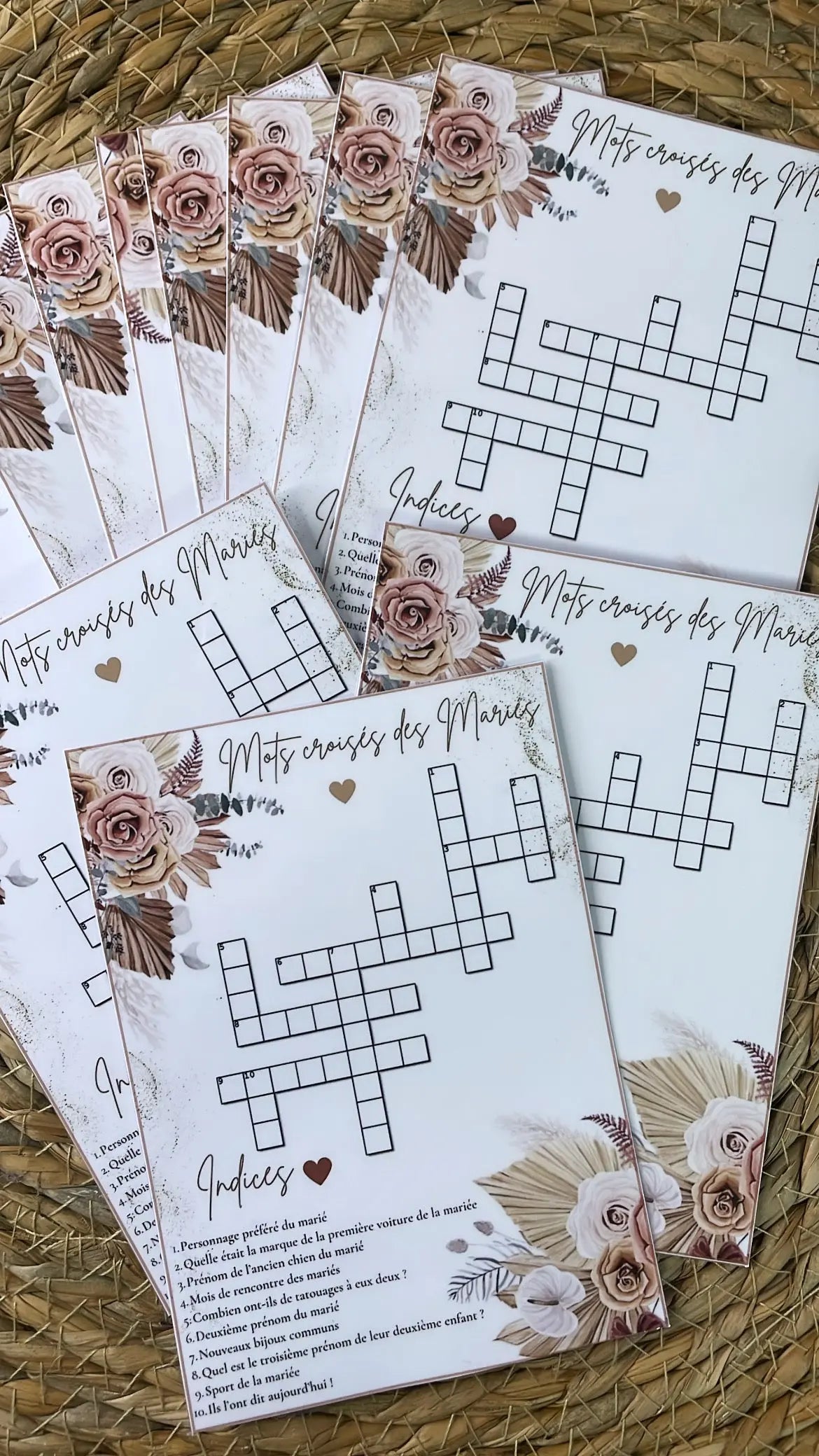 Par tables, par couples ou seul(es), vos convives auront de quoi s'occuper pendant votre évènement ! Les mots croisés des mariés sont entièrement personnalisables par nos soins, selon votre thème ou code couleur. Nous vous proposons quelques visuels disponibles mais vous pouvez nous contactez directement si demande particulière.